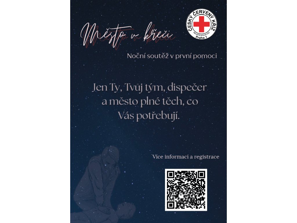 Zveme vás na zbrusu novou noční soutěž první pomoci Město v křeči, která se uskuteční z pátku 5. června na sobotu 6. června 2026. Soutěž je určena pro středoškolské a dospělé laické týmy se zájmem o první pomoc.